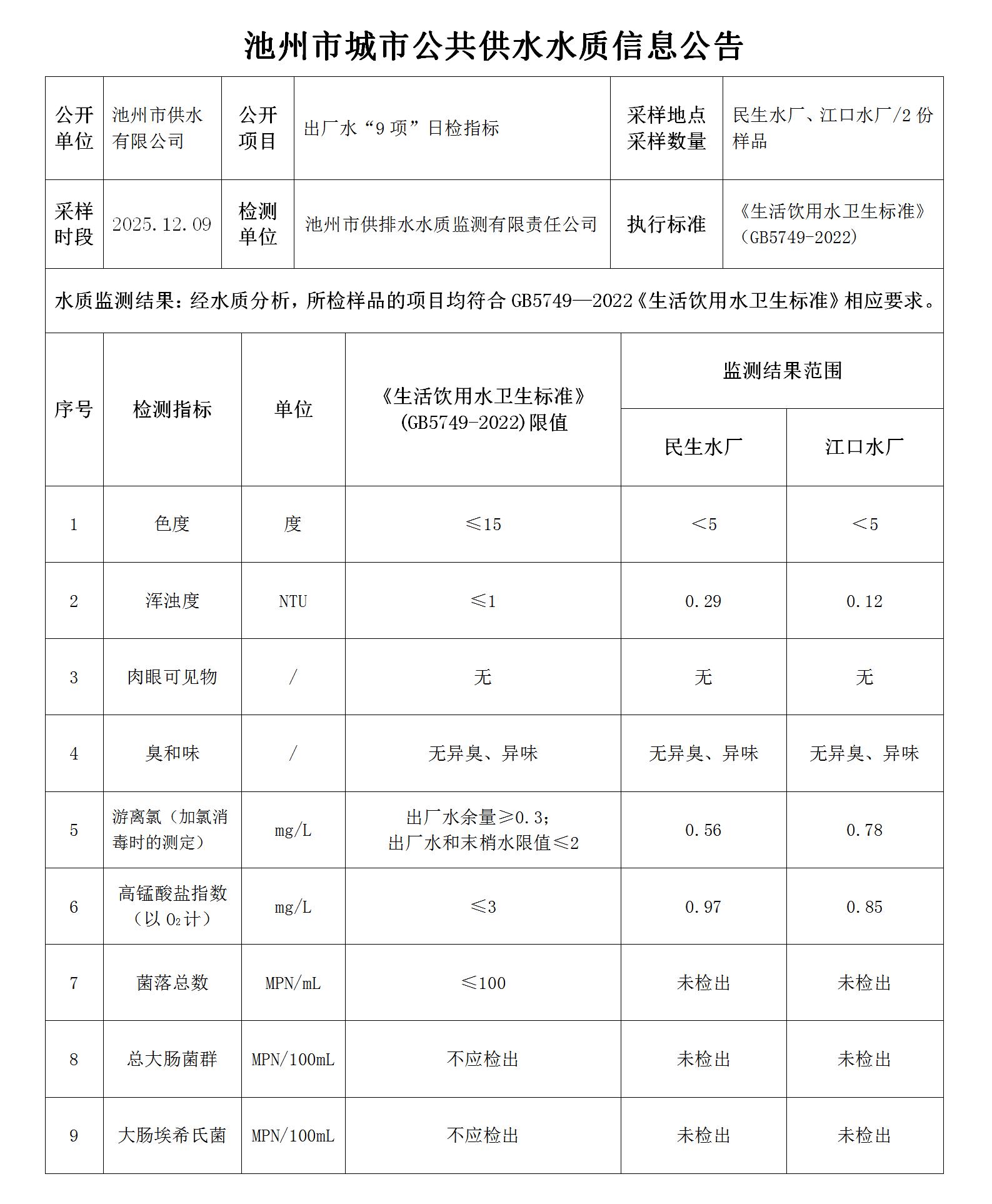 | 池州市城市公共供水水質(zhì)信息公告出廠水“9項(xiàng)”日檢指標(biāo)20251209 | |